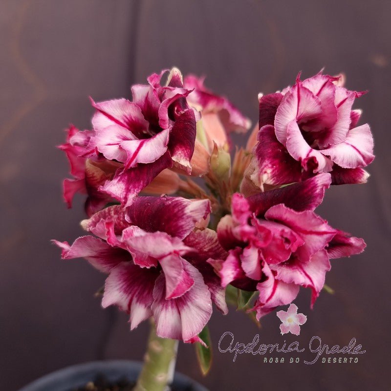 Espécie: Adenium obesum (Rosa do Deserto). Origem: Cultivada no Brasil pela Apolonia Grade. Garantia: Plantas 100% saudáveis e bem enraizadas. Floração: Abundante em condições ideais de cultivo.