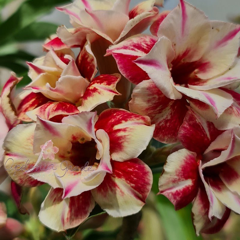 Espécie: Adenium obesum (Rosa do Deserto). Origem: Cultivada no Brasil pela Apolonia Grade. Garantia: Plantas 100% saudáveis e bem enraizadas. Floração: Abundante em condições ideais de cultivo.