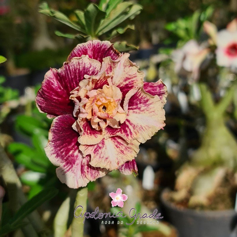 Espécie: Adenium obesum (Rosa do Deserto). Origem: Cultivada no Brasil pela Apolonia Grade. Garantia: Plantas 100% saudáveis e bem enraizadas. Floração: Abundante em condições ideais de cultivo.