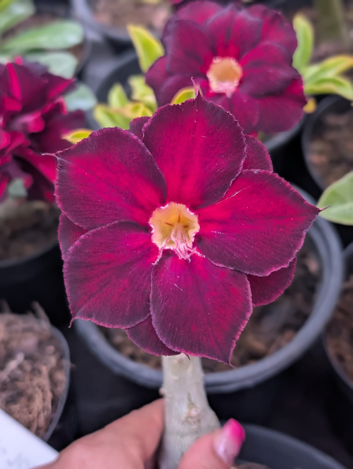 Rosa do Deserto de qualidade premium, cultivada com dedicação e carinho pela equipe Apolonia Grade. Nossa planta é adaptada ao clima brasileiro e está pronta para florescer no seu jardim, varanda ou espaço favorito. Cada exemplar é cuidadosamente selecionado para garantir saúde e beleza.