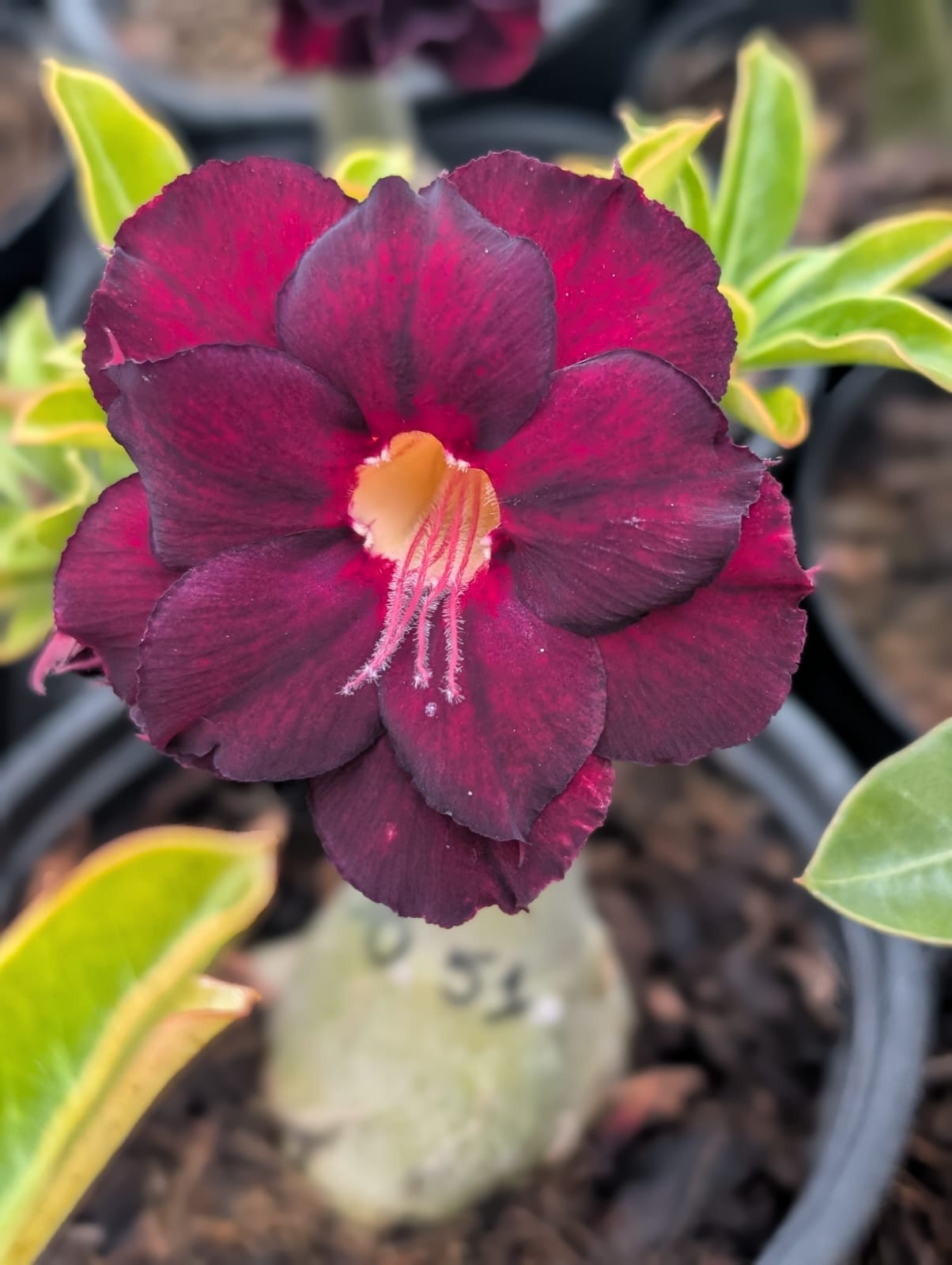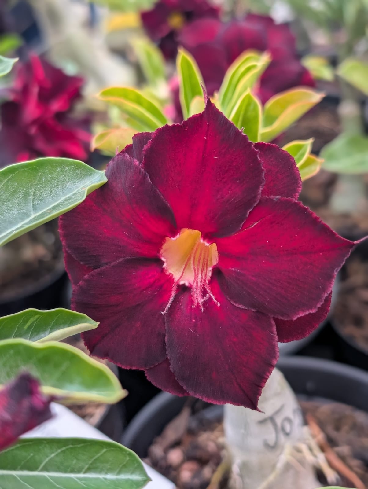 Espécie: Adenium obesum (Rosa do Deserto). Origem: Cultivada no Brasil pela Apolonia Grade. Garantia: Plantas 100% saudáveis e bem enraizadas. Floração: Abundante em condições ideais de cultivo.